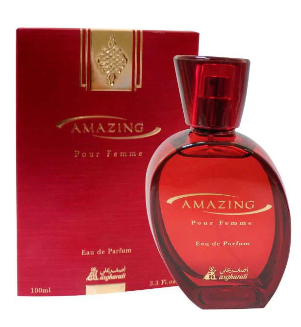 Amazing von Asgharali ist eine duftige Parfümkomposition aus der olfaktorischen Familie der fruchtig-blumigen Gourmand-Düfte für Damen. Die Kopfnoten bestehen aus Himbeere, Zitrone, Bergamotte, Mandarine, Orange und Pfirsich; die Herznoten umfassen Rose, Jasmin, grüne Noten, Gardenie, Narbenblüte, marine Akzente und Veilchen; die Basisnoten sind Honig, Patchouli, Vanille, Amber und Moschus.