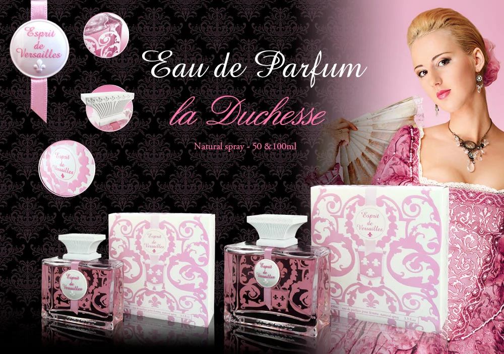 La Duchesse von Esprit de Versailles ist eine orientalische florale Damenparfümkomposition. Die Nase hinter dieser Schöpfung ist Honorine Blanc. Die Kopfnoten bestehen aus Pfirsich, Freesie und Mandarine; die Herznoten aus Lilie, Jasmin und Talis; die Basisnoten aus Karamell, Vanille und Sandelholz.