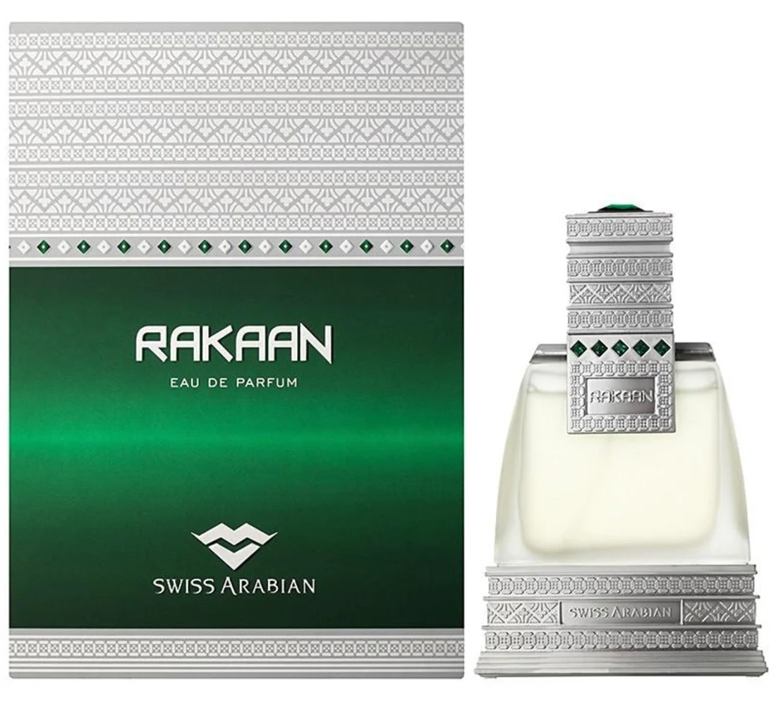 Rakaan von Swiss Arabian ist ein orientalisch-hölzernes Duft für Männer. Die Kopfnoten sind Zitrone und Grapefruit; die Herznote ist Lotusblüte; die Basisnoten bestehen aus Oud-Holz, Sandelholz und Moschus.